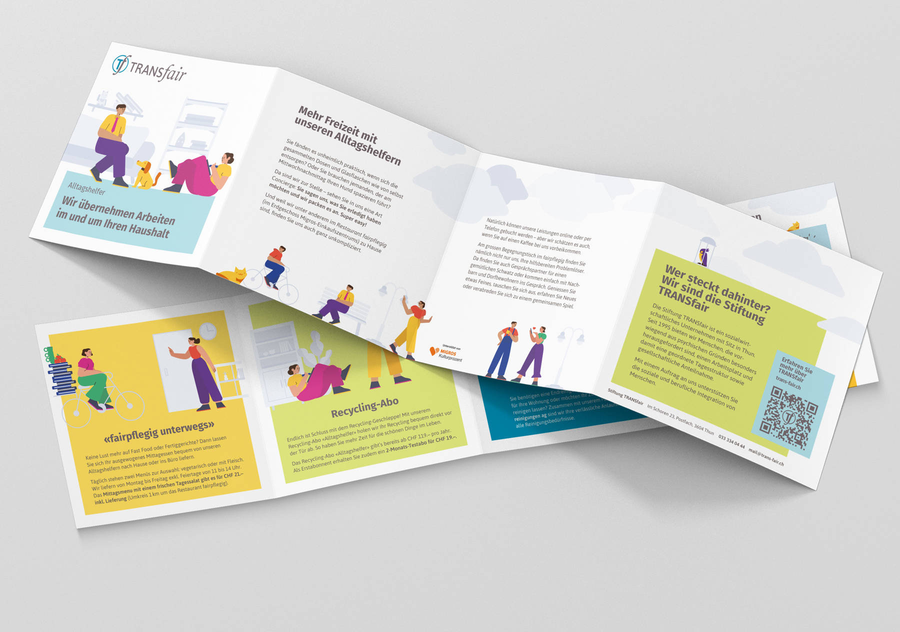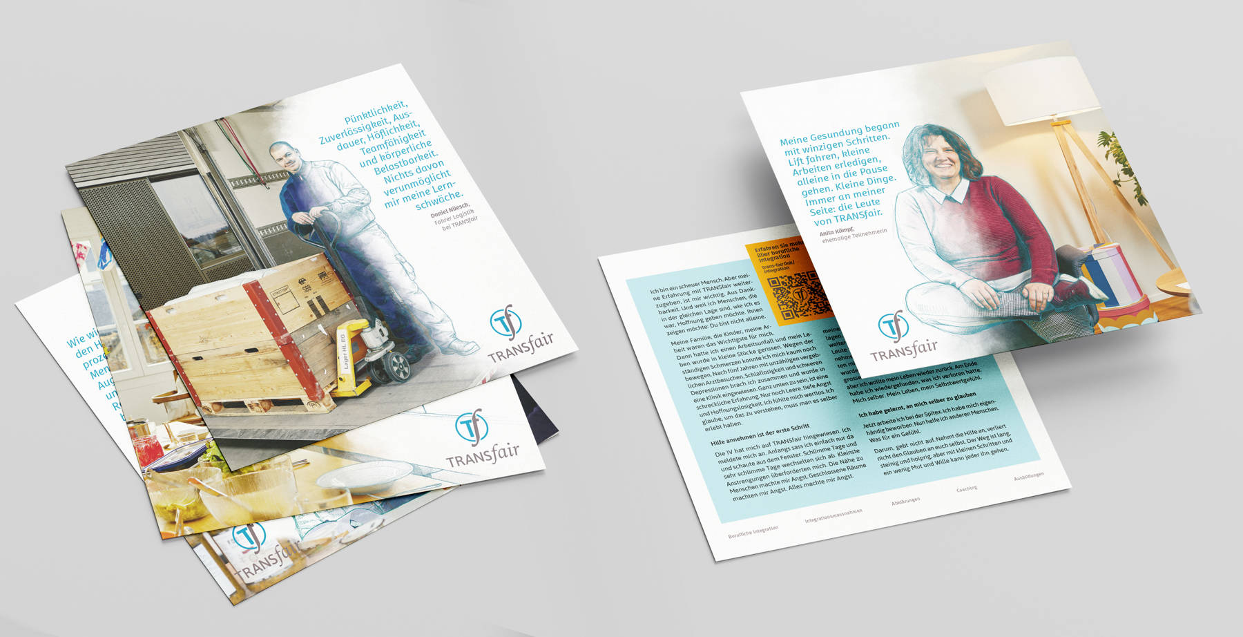 Die Marke TRANSfair erhielt durch uns ein einzigartiges Gesicht – oder besser gesagt: einzigartige Gesichter. Der Illustrationsstil, der aus den Kernaufgaben von TRANSfair entsprungen ist, macht spürbar, worum es geht: psychische Stabilität, Resilienz und den Weg zurück in den Arbeitsmarkt.